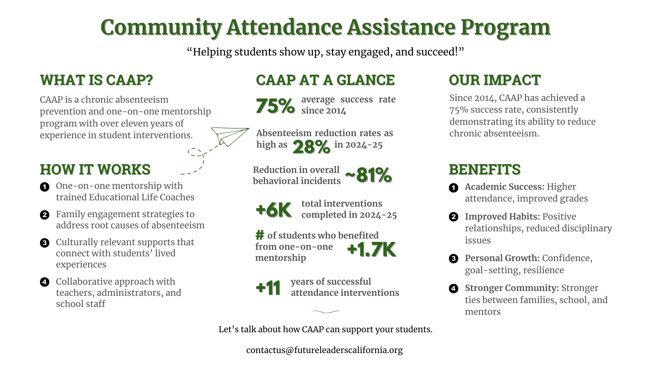 Future Leaders California is a youth-development organization dedicated to empowering youth through mentorship, education, and the arts. FLC serves at-promise youth in the Antelope Valley through three core initiatives: the Community Attendance Assistance Program (CAAP), the Justice Sunday Arts Initiative (JSAI), and the Teen Talk Initiative. Since its founding, FLC has impacted over 22,000 youth, helping participants gain admission to top institutions like UCLA, NYU, and UC Irvine. Many alumni have gone on to become leaders in law, education, and business.